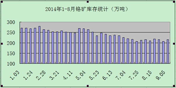 中国铁合金网讯:2014年以来,中国铬矿库存大体呈稳中下行趋势,其中一个重要原因就是因中国铬铁行情低迷,导致铬矿进口量较前一年度整体下滑。中国9月初,铬矿库存大体位于215万吨左右,较1月初的270万吨下降了55万吨。虽然8月份铬矿库存较7月底略有反弹,但是变动不是太明显,港口现货库存整体仍处于低位,而且以工厂自己库存居多。