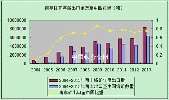 图1. 2004-2013年南非及全球铬矿出口量(吨)及所占比重。