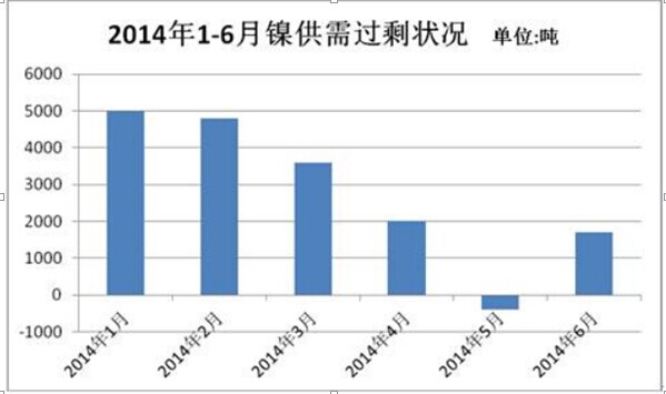 据国际镍研究组织INSG的报告称,今年1-6月,全球镍市供应过剩1.18万吨,2013年同期为供应过剩7.28万吨,2014年全球镍市预计供应过剩5万吨,过剩量将较2013年的17万吨大幅缩减。镍的供应方面总体供大于求,但过剩局面较2013年已经有较大程度缓解。