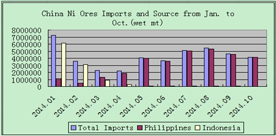 中国铁合金网讯:海关公布的数据显示:2014年10月中国进口镍矿4,151,527吨,环比降10.5%,同比下降43.5%。其中从菲律宾进口4,115,474吨,占进口总量的99.1%,从澳大利亚进口13,331吨,自印尼禁矿以来,印尼矿到港数量首次降为零。1-10月份累计进口4243.6万吨,较去年同期的5689.8万吨下降了25.4%。其中,菲律宾镍矿总量为3126万吨,较去年同期的2517.8万吨上涨了24.1%。从印尼进口1061.5万吨,同比下降66%。从澳大利亚进口镍矿17.8万吨,同比降34%。