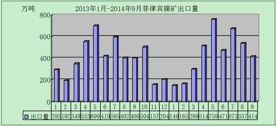 下图为2013年1月份至2014年9月份菲律宾镍矿出口量(单位:万吨)