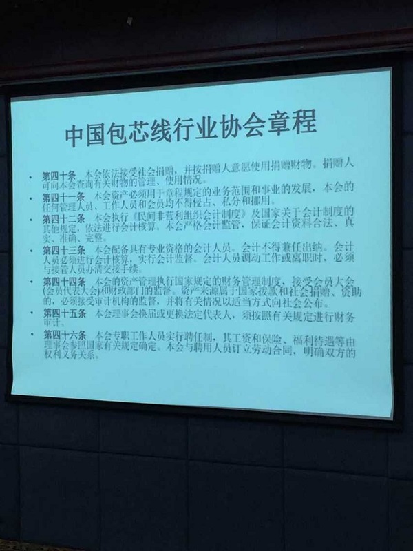 中国铁合金网讯:由中国包芯线行业协会(筹)主办 “中国包芯线行业协会第一届一次会员大会和理事会会议”于2015年10月10-11日在江阴市汉皇国际大酒店顺利召开。会议的主要内容是:选举理事长单位,副理事长,理事单位,修改和确定协会章程和协会的宗旨,以及理事单位和会员单位的会员费标准;以及商讨如何规范行业秩序和在协会的领导下推进行业的进步。要求会员企业法人参会。