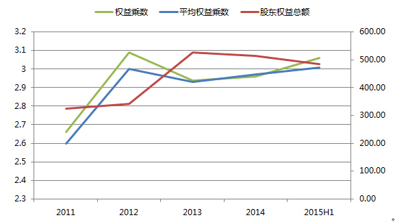 从上图中可见,股东权益总额开始走下坡,权益乘数上行,表明企业财务杠杆加大,风险越大。
