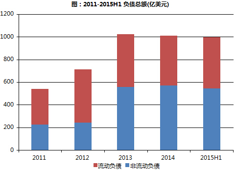 截止2015年6月30日,嘉能可负债总额为997.26亿美元。自2012年嘉能可开始着手收购超达以来,其债务规模在次年到达峰值,但之后逐年递减。