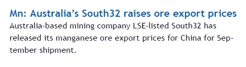 中国铁合金网讯:澳大利亚South32公司提高9月对华锰矿出口装船价格。