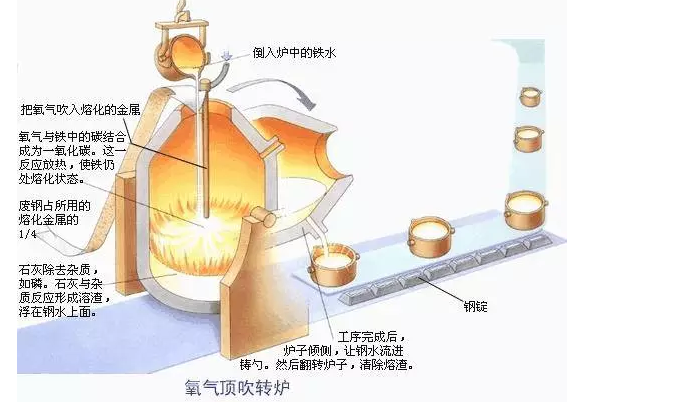 生铁中的各种杂质,在高温下,在不同程度上都与氧有较大的亲和力。因此可以利用氧化的方法使它们成为液体、固体或气体氧化物,液体和固体氧化物在高温下与炉衬和加入炉内的熔剂起作用,结合成炉渣,并在扒渣时被排除炉外,气体也在钢水沸腾时被CO带到炉外。