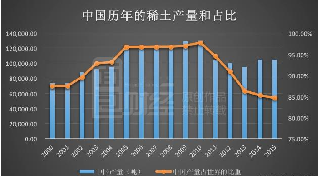 其实中国稀土行业“挖空国土供应全球”的局面已经持续多年:下图是面包财经根据统计数据绘制的中国稀土产量和占比: