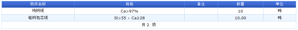 1:纯钙线中芯线为金属钙丝,Ca≥97%,芯线比重>55g/m,外包铁皮,铁皮厚度大于0.95mm,钙线外径9.0±0.5mm,Ca<96%每降低1%扣200元,Ca<94%退货;按需要通知送货,送货时附带质保书。产品不合格供方及时更换,保证生产使用。