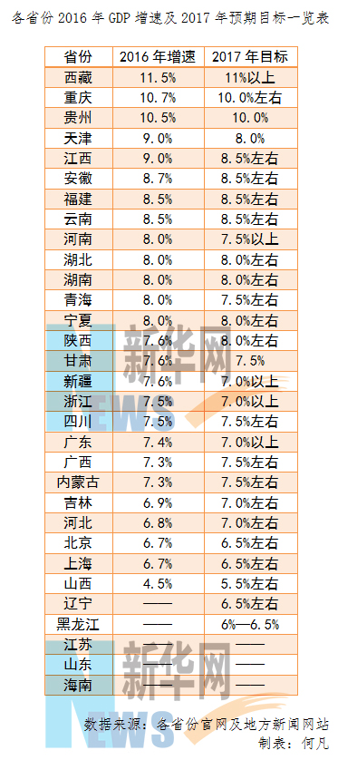 在多数省份维持或微幅下调经济增长目标时,西藏、宁夏、四川等地却在上调经济增长目标。其中,西藏将2017年GDP增长目标由2016年的10%以上调整为11%以上,宁夏由7.5%上调至8%,四川则由7%上调至7.5%。此外,新疆在设定目标时措辞有微妙变化:2016年为“7%左右”,2017年则表述为“7%以上”。