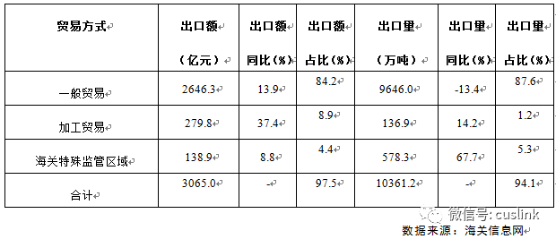 一般贸易方式是我国“两高一资”商品出口的主要方式,出口额为2646.3亿元,同比增长13.9%,占比为84.2%,出口数量为9646万吨,同比下降13.4%,占比为87.6%。加工贸易和海关特殊监管区域出口额同比分别增长37.4%和8.8%,出口数量同比分别增长14.2%和67.7%。