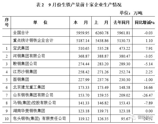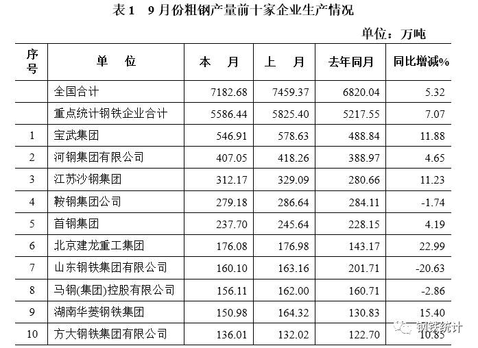 表1 9月份粗钢产量前十家企业生产情况