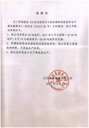 江苏如皋钢铁有限公司于2017年6月3日到6月18日期间完成1台40吨电炉拆除工作;2017年9月5日当地政府对另外1台40吨电炉进行封存,变压器等动力装备拆除;企业承诺不再恢复生产。