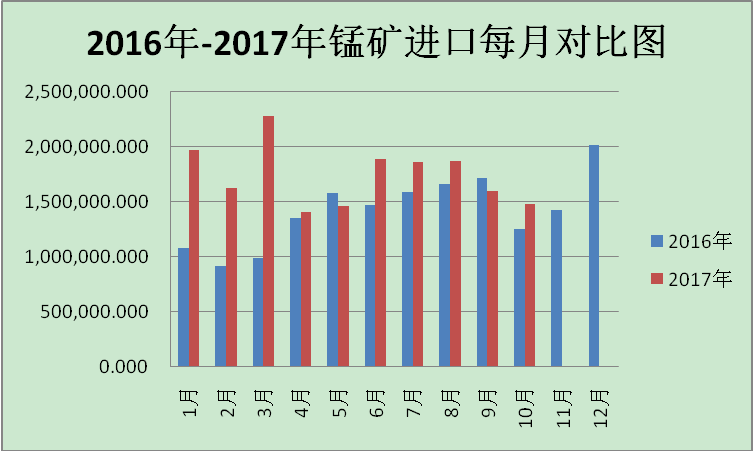 中国铁合金网讯:据海关数据统计,2016年全年全国锰矿进口数量为17,053,357.359吨.2017年锰矿的进口数量比2016年上涨,尤其是第一季度,2016年第一季度锰矿进口数量总数2,993,088.427 吨,而同期2017年的进口数量为5,879,297.883 吨,同比增长近一倍。除5月和9月外,2017年的锰矿进口数量比2016年的进口数量都不同幅度的增加,部分月份增加甚至高达130%。整体来看,目前2017年前10月份锰矿的进口数量总数为17,467,965.114吨,已经比去年锰矿进口全年的数量还高了2.43个百分点。