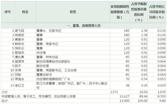 2、本计划授予涉及的激励对象1709人(占公司总人数的23%,宝钢股份激励对象为1080人),包括公司董事、高级管理人员、中层管理人员、骨干员工、劳动模范、突出贡献人员以及公司董事会认为需要激励的其他员工。上述任何一名激励对象通过本激励计划获授的限制性股票均未超过公司股本总额的 1%。