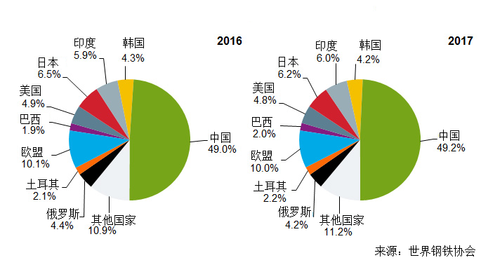 亚洲国家中,中国粗钢产量为8.32亿吨,较上年增长5.7%;占世界比例从2016年的49%升至49.2%。其他国家中,日本产量为10466万吨,下降0.1%;印度产量为10137万吨,首次超过1亿吨,增长6.2%;韩国产量为7108万吨,增长3.6%;巴基斯坦产量为495万吨,增长39.3%;越南产量为1030万吨,增长99.8%;泰国产量为382万吨,增长17.2%。