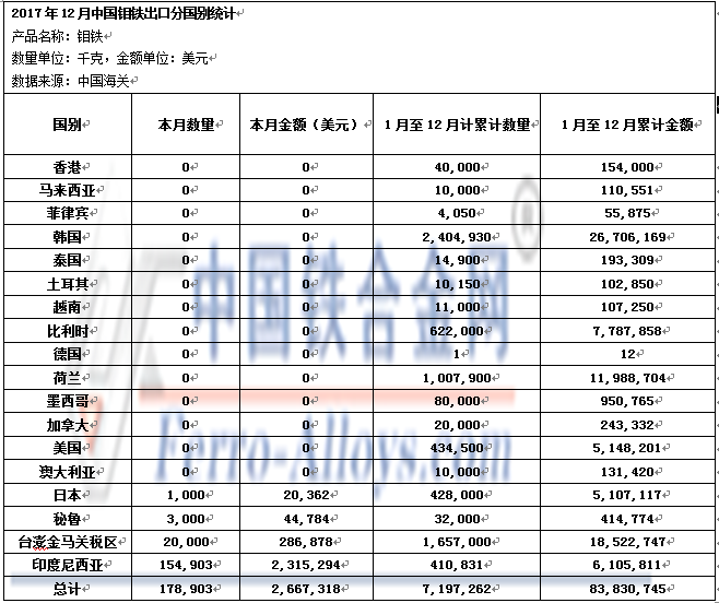 中国铁合金网讯:2017年12月中国出口钼铁178.903吨,同比增加17,790.30吨,环比增加10%。 2017年前1-12月中国累计出口钼铁7197吨,同比增加61.27%,其中出口日本20.362吨,出口秘鲁44.784吨,出口台澎金马关税区286.878吨,出口印度尼西亚2315.294吨。