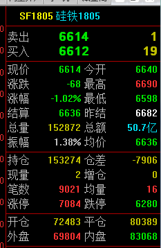 中国铁合金网讯:2月9日期货硅铁1805合约收盘跌1.02%,期货硅铁1805合约收盘6614,跌幅1.02%,结算价6636,今日开盘价6640,最高价6690,最低价6598,成交量152872手,持仓量153274。