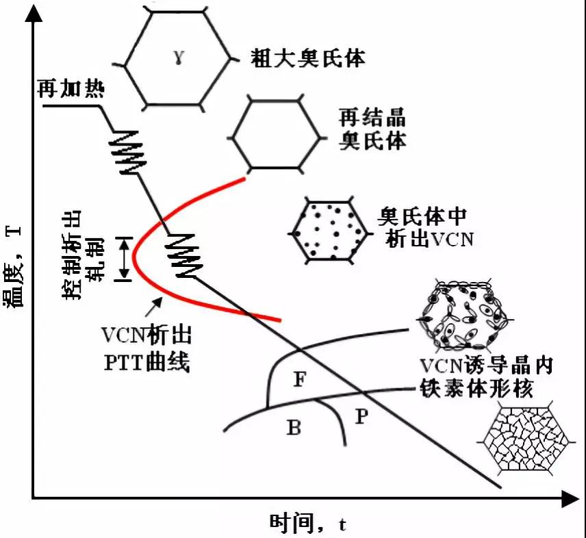 近年来,随着研究工作的不断深入,人们开发出一系列钒微合金化的新技术和新工艺。VN晶内铁素体(IGF)形核技术与RCR工艺结合,形成了第三代TMCP工艺。该工艺采用V-N微合金化设计,通过RCR细化原始奥氏体晶粒,依靠终轧阶段的形变诱导VN在奥氏体中的析出,促进IGF形核,细化了铁素体组织。这一新工艺技术不仅发挥钒的传统沉淀强化优势,还利用VN促进IGF形核起到了晶粒细化作用,充分发挥了微合金钢晶粒细化和沉淀强化的优点,该技术在一些难以实现低温控轧的钢铁产品,如厚壁型钢、高强度厚板等,获得了成功应用。
