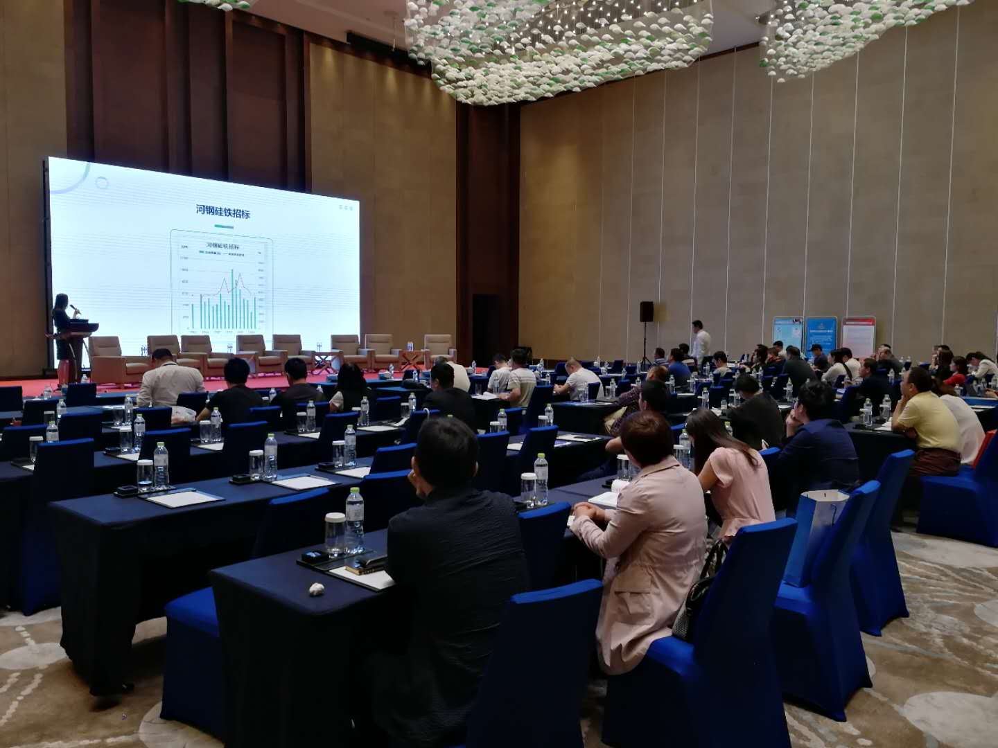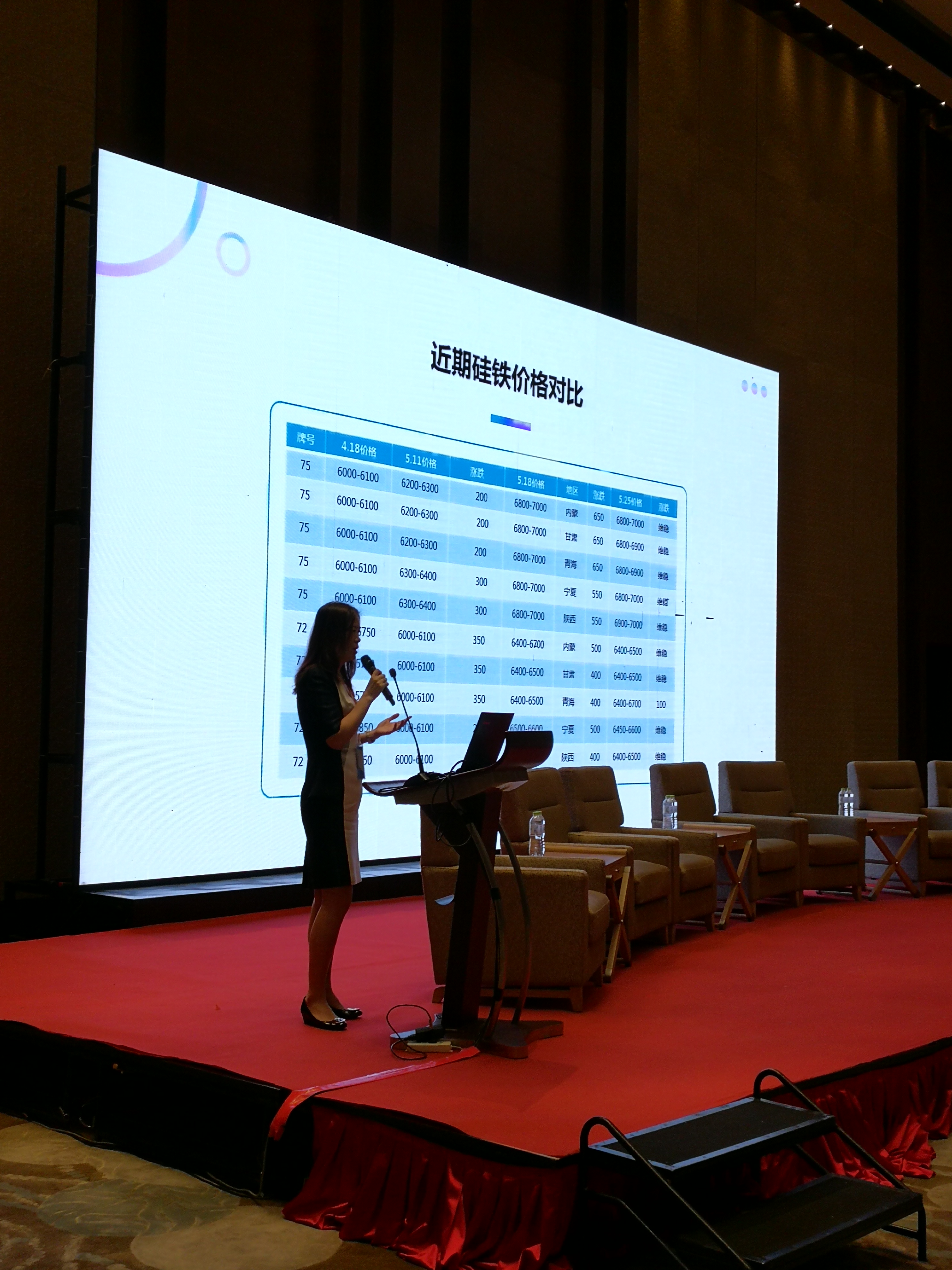 紧接着上台演讲的是北京陇悦矿业有限公司总经理王慧英女士。王经理结合着自身从业的多年经历,讲述了硅铁行业的发展态势,硅铁价格的变化指数以及硅铁出口市场的状况,对硅铁市场特点进行了总结。之后对后市进行了分析与展望。