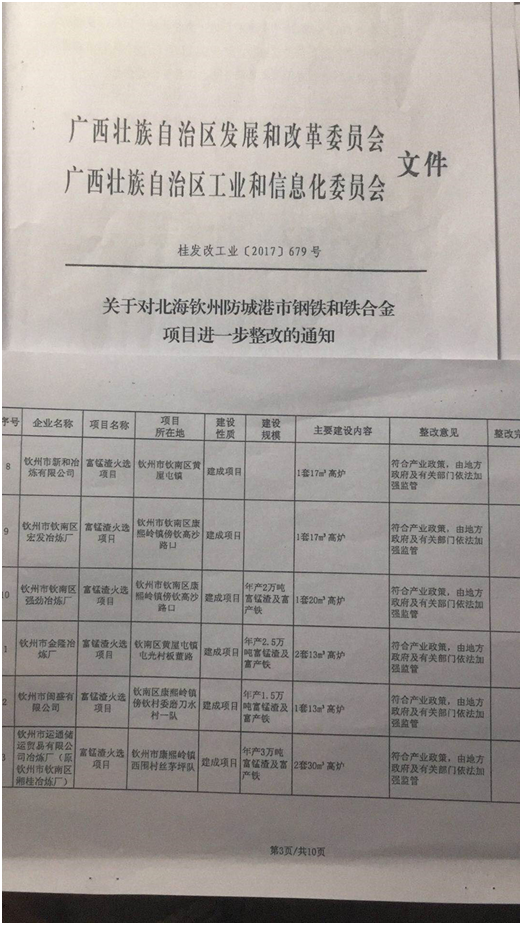 根据《产业结构调整指导目录(2011年本)(修正)》,100立方米及以下铁合金锰铁高炉属于淘汰类落后工艺装备。但自治区发改委、工信委及钦州市有关部门以富锰渣不属于锰铁合金为由,不仅没有严格把关,而且层层“放水”。自治区发改委、工信委2017年6月1日联合印发《关于对北海钦州防城港市钢铁和铁合金项目进一步整改的通知》,认定钦州市23个使用13-50立方米高炉冶炼项目符合产业政策,其中5个项目生产设备实际于2013年前就已拆除。