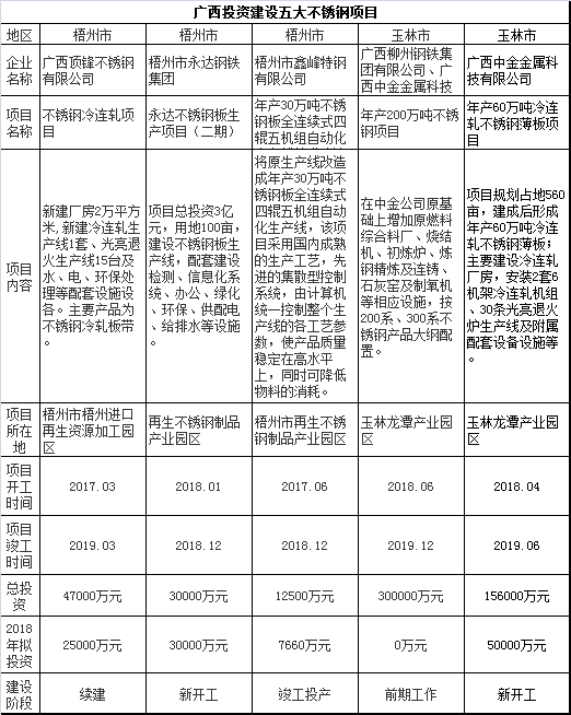 【中国铁合金网讯】 近日,广西壮族自治区工信委发布《2018年自治区重点工业项目分级协调工作方案》(以下简称“《方案》”),《方案》公布了2018年广西拟重点推进的项目,其中涉及到五大不锈钢项目。