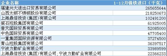 【中国铁合金网讯】1-12月镍铁进口量前十企业统计如下:福建兴大(26.57),太钢(21.83),鼎信投资(10.25),振石控股(6.19),普天国际贸易(5.21),中色国际(4.77),一重集团(3.73),青山控股(3.64),力勤(3.40),鼎信投资&力勤(2.24)。单位:万吨。