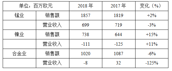 锰矿石(Comilog)和矿化砂(TiZir)的良好表现被由镍业务的生产困难以及高性能合金部门面临的不利市场环境影响抵消,Sandouville和Aubert&Duval工厂亏损,2018年营业收入5.81亿欧元;