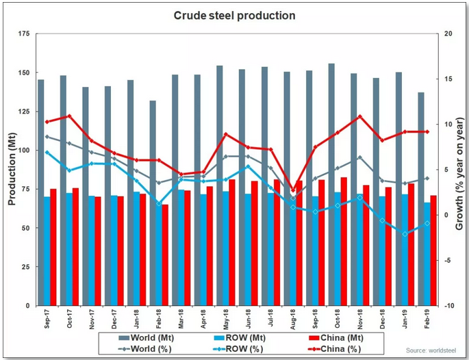 美国2019年2月粗钢产量为690万吨,同比提高4.6%。
