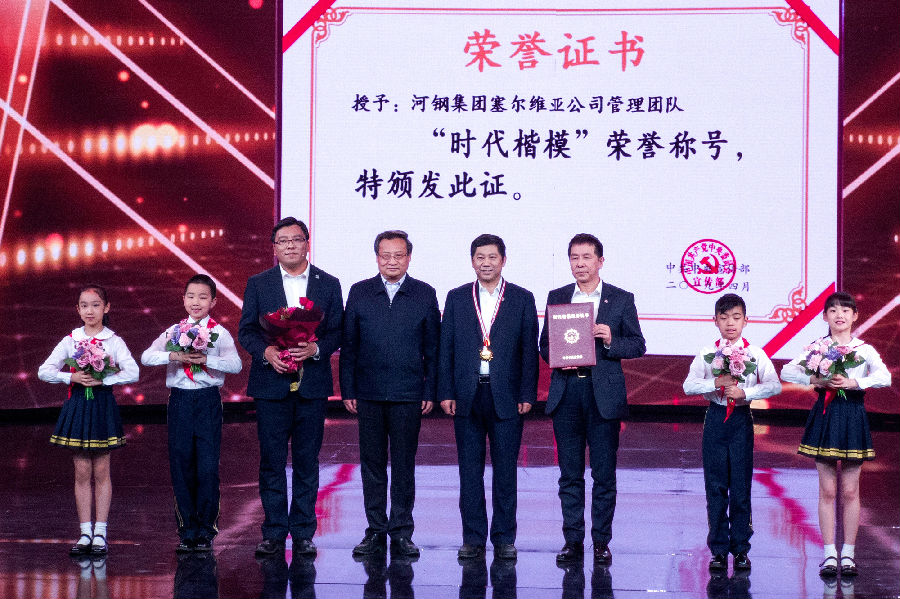 【中国铁合金网讯】4月25日,中央宣传部在中央广播电视总台《时代楷模发布厅》向全社会公开发布河钢集团塞尔维亚公司(以下简称河钢塞钢)管理团队的先进事迹,授予他们“时代楷模”称号。国家发展改革委副主任宁吉喆,中央宣传部副部长梁言顺,副省长李谦出席发布仪式。发布仪式现场宣读了《中共中央宣传部关于授予河钢集团塞尔维亚公司管理团队“时代楷模”称号的决定》,梁言顺为河钢塞钢管理团队代表颁发“时代楷模”奖章和荣誉证书。