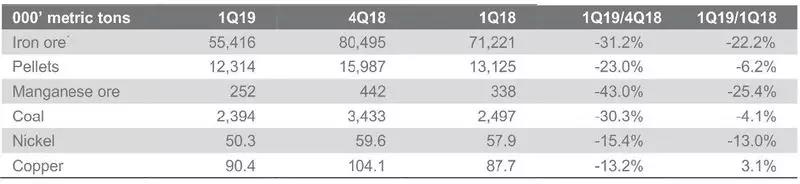 【中国铁合金网讯】日前,淡水河谷发布2019年第一季度产销量报告。