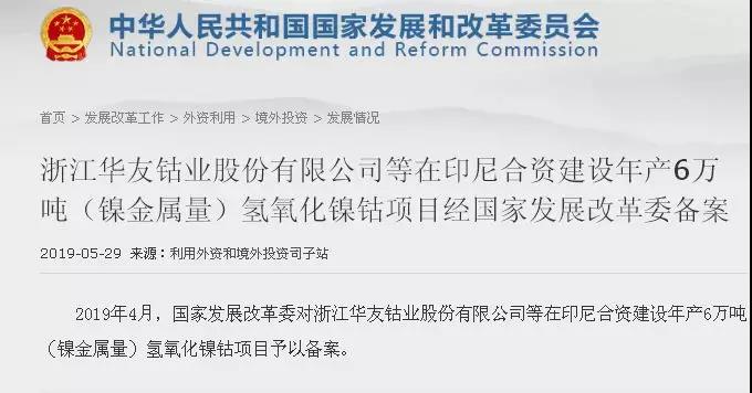 【中国铁合金网讯】2019年4月,国家发展改革委对浙江华友钴业股份有限公司等在印尼合资建设年产6万吨(镍金属量)氢氧化镍钴项目予以备案。