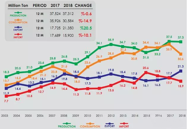 对土耳其来说,充分利用成品材资源的价格优势开发西非以及东南亚新兴出口市场成为土耳其新的钢材出口机遇。由于中国钢铁行业淘汰落后产能取得了显著的成效,加上稳定的内需,钢企的内贸利润得以保障,成品材的出口价格优势并不明显。以螺纹钢为例,目前中国大型钢厂出口报价为490-500美元/吨(FOB),而土耳其至新加坡的报价约为485美元/吨(CFR),价格优势明显,但是随着东南亚及印度的钢铁新增产能逐步上马,势必会为土耳其钢材出口带来一定压力。综合来看,内需不振加上出口受阻,2019年土耳其钢铁行业无疑会在困境中度过,无论是粗钢产量还是成品材出口量都很难达到2018年的水平。