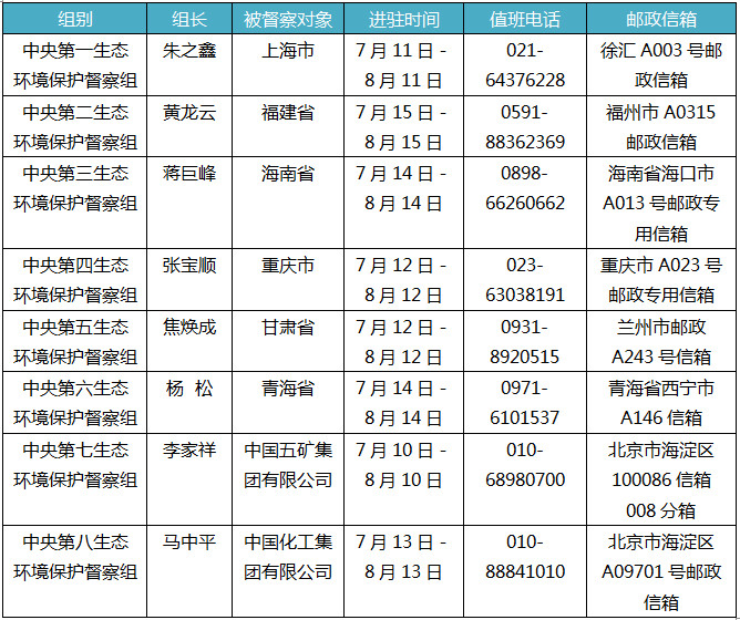 根据安排,第二轮第一批中央生态环境保护督察进驻时间为1个月。进驻期间,各督察组分别设立专门值班电话和邮政信箱,受理被督察对象生态环境保护方面的来信来电举报,受理举报电话时间为每天8:00-20:00。截至7月15日20时,8个督察组共计受理群众来电来信举报809件,经梳理合并重复举报后,向被督察对象转办569件。