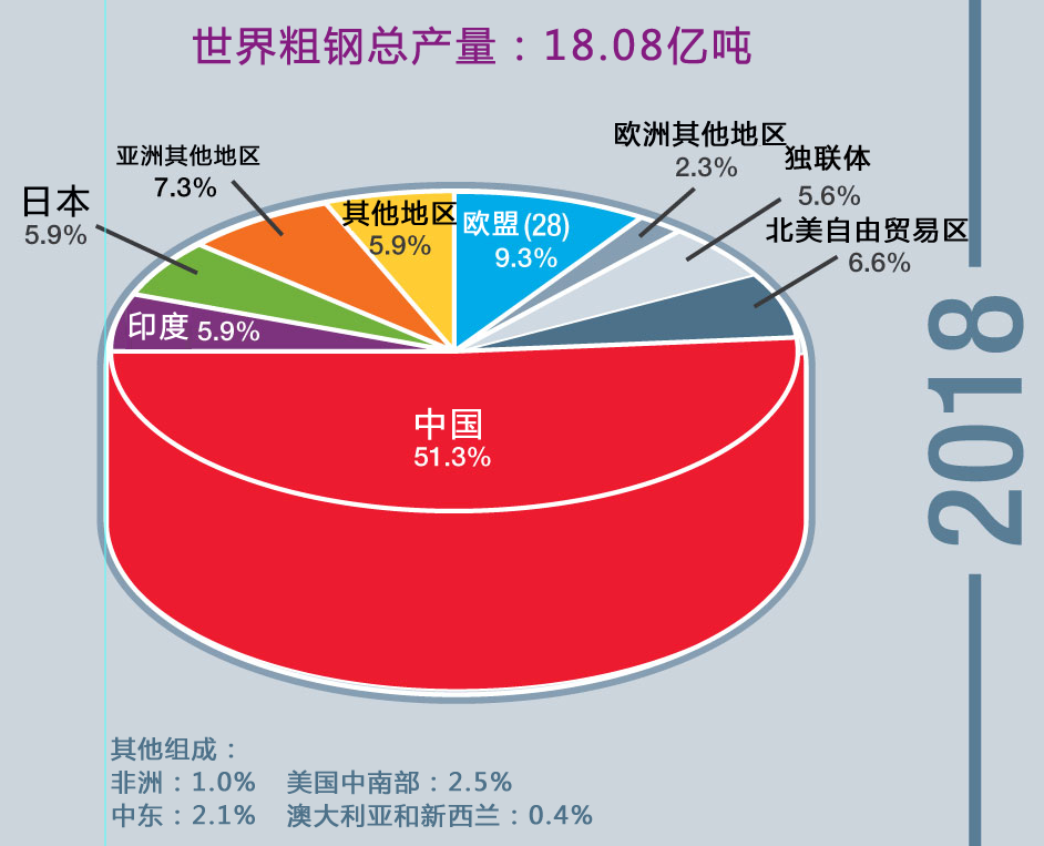根据数据,2018年,世界粗钢总产量18.08亿吨,中国粗钢总产量9.28亿吨,约占世界总产量的51.3%。