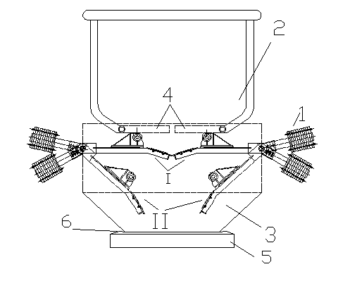 焦罐装焦时,间断产生阵发性烟尘外溢,给现场职工及周围环境、设备带来影响。车间技术人员,经过外出考察、操作实践,对装入装置进行改造,在装入装置上料斗增加了两块活动盖板。如图2所示,1为除尘盖板,2为焦罐,3为装入装置料斗,4为焦罐底闸门,5为水封罩,6为耐高温石棉布。盖板有Ⅰ和Ⅱ两个状态,焦罐装焦时落在装入装置料斗支座上,并与支座一起下降一段距离,焦罐底闸门靠重力自动打开,同时盖板受焦罐底闸门重力作用打开,此时盖板处于状态Ⅱ,装焦完成焦罐提起,盖板靠配重作用自动合拢,此时处于状态Ⅰ,避免了装焦过程中粉尘大量外溢,并且因盖板的增加,增强了密封性,提高了除尘风机的吸力,起到了良好的除尘效果。