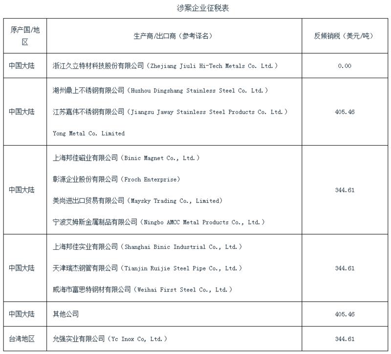 【中国铁合金网讯】2019年7月25日,巴西经济部发布第506号法令,对原产于中国大陆和台湾地区的奥氏体不锈钢圆形焊管(葡语:tubos com costura, de açosinoxidáveis austeníticos graus 304 e 316,de seção circular)作出第一次反倾销日落复审终裁:1. 继续对中国大陆涉案产品征收为期5年的反倾销税;2. 终止对台湾地区涉案产品的调查,不建议继续延长对台湾地区进口产品征收反倾销税(除允强实业有限公司(Yc Inox Co, Ltd.)之外),具体税额见下表(涉案企业征税表)。涉案产品的南共市税号为7306.40.00和7306.90.20。