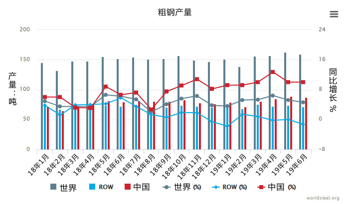 中国铁合金网:2019年6月全球64个纳入世界钢铁协会统计国家的粗钢产量为1.59亿吨,同比提高4.6%。