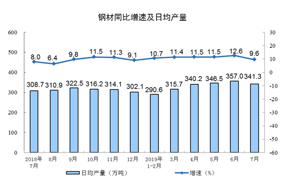 2019年7月我国钢材产量10582万吨,同比增长9.6%;1-7月钢材产量69776万吨,同比增长11.2%。
