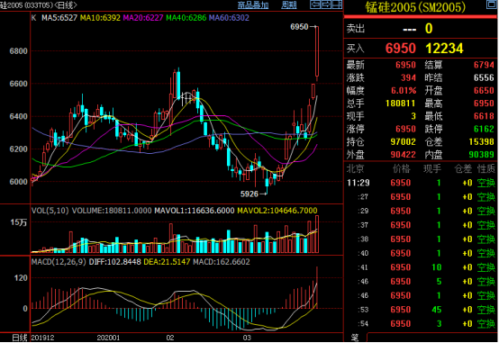 硅锰期货:今日硅锰2005合约强势上行,直逼7000点,开盘6650,涨停6950,涨幅6.01%,创逾半年新高。
