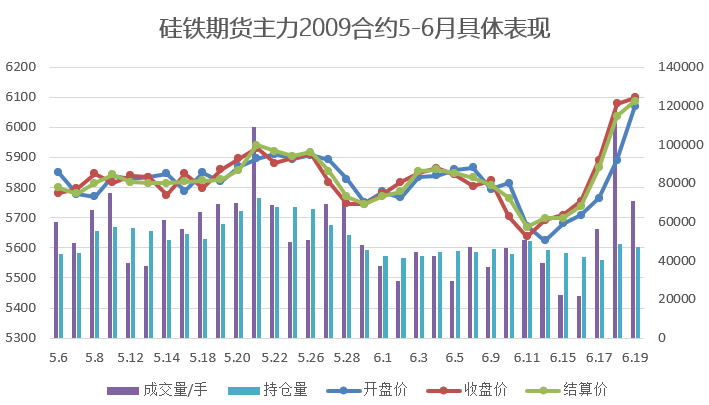 【期货行情】本周硅铁期货主力2009合约开盘价5680,最高价6128,最低价5660,收盘价6098,结算价6086,持仓量47089,成交量289822。
