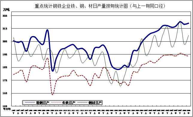 本月(8月,下同)重点统计钢铁企业累计平均日产粗钢215.68万吨,环比增长0.37%、同比增长5.15%;生铁191.18万吨,环比减少0.41%、同比增长4.70%;钢材203.34万吨,环比减少1.83%、同比增长5.56%。