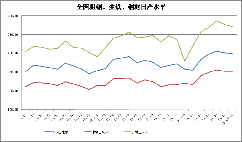 2020年8月中旬,重点统计钢铁企业共生产粗钢2161.02万吨、生铁1906.30万吨、钢材2067.86万吨、焦炭321.38万吨。本旬(8月中旬,下同)平均日产,粗钢216.10万吨,环比增长0.35%、同比增长5.20%;生铁190.63万吨,环比减少0.56%、同比增长3.99%;钢材206.79万吨,环比增长3.45%、同比增长6.15%。