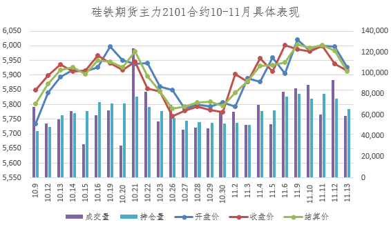 【期货行情】11月第二周,硅铁期货盘面呈窄幅下调态势。硅铁期货主力2101合约开盘价6,020,最高价6,040,最低价5,888,收盘价5,916,结算价5,912,成交量386,836,持仓量65,990。