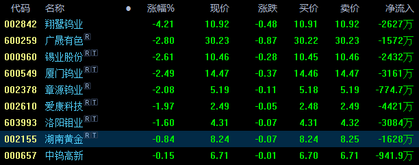 截止本周五收盘,钨上市公司全部下跌,具体为:翔鹭钨业跌超2%,广晟有色、锡业股份跌近3%,厦门钨业、章源钨业跌超2%,爱康科技、洛阳钼业跌近2%,湖南黄金跌近1%,中钨高新跌幅不足1%。