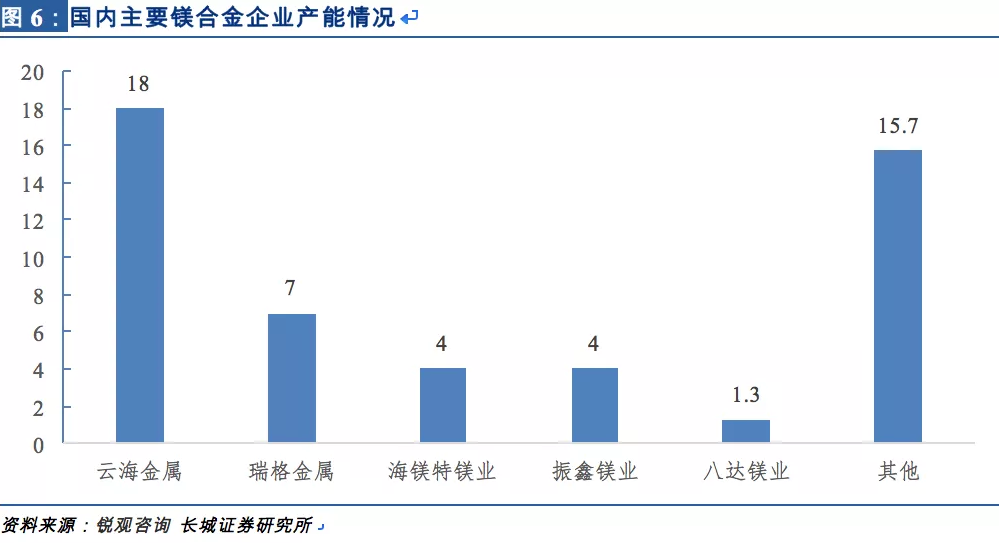 由于生产工艺存在一定的技术壁垒,国内镁合金行业目前集中度比原镁行业更高,云海金属为行业龙头企业,拥有产能18万吨,占行业总产能36%。瑞格金属及海镁特镁业次之,分别拥有镁合金产能7万吨、4万吨。