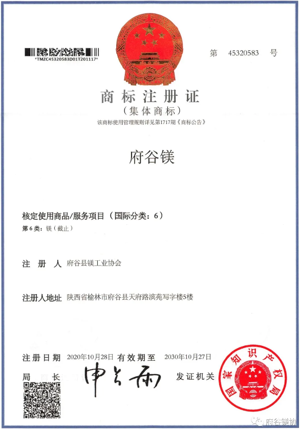 中国铁合金网讯:日前,由府谷县镁工业协会作为注册人申报的“府谷镁”商标(国际分类:第6类)在国家知识产权局注册成功,这是府谷镁工业树立统一品牌形象,提升镁产业发展软实力的又一重要举措。“府谷镁”商标的成功注册,对于提升府谷镁产业质量、扩大市场份额、促进转型升级等方面都具有极其重要的意义。