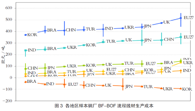 欧盟27国采用BF-BOF流程生产线材的平均成本最高,为516欧元/吨,即使成本最低的钢厂也几乎无法与其他国家竞争,而韩国BF-BOF流程线材平均生产成本最低,仅371欧元/吨(图3)。