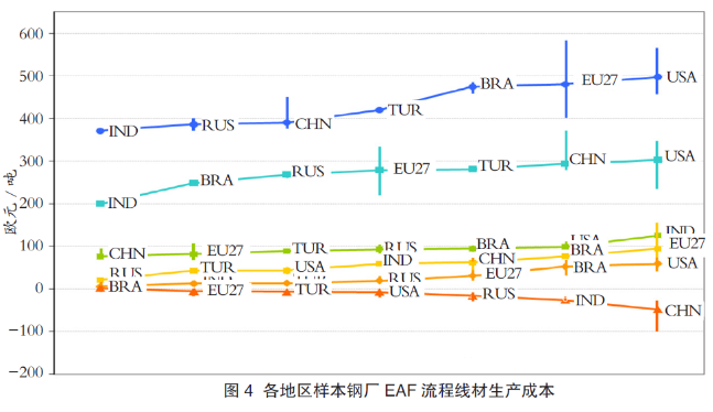 2)欧盟27国采用电炉流程生产线材的副产品收益平均只有6欧元/吨,即无法从回收材料和能源中获得很多收益,特别是与中国相比。
