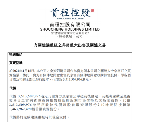 首程控股公布,于2021年1月15日,公司之全资附属公司作为卖方与公司之关连人士京富订立买卖协议,以约35.14亿港元出售首程控股持有首钢资源全部股份,出售完成后,首程控股不再持有首钢资源股份。此外,本次出售价为2.4港元,较首钢资源最后交易日收市价溢价29.73%。