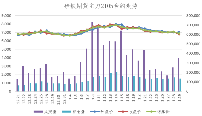 【期货行情】本月硅铁期货2105主力合约走高后下行。月开盘6,670,最高价7,980,最低价6,572,收盘价6,752,结算价6,850,成交量7,727,769,持仓量134,943。